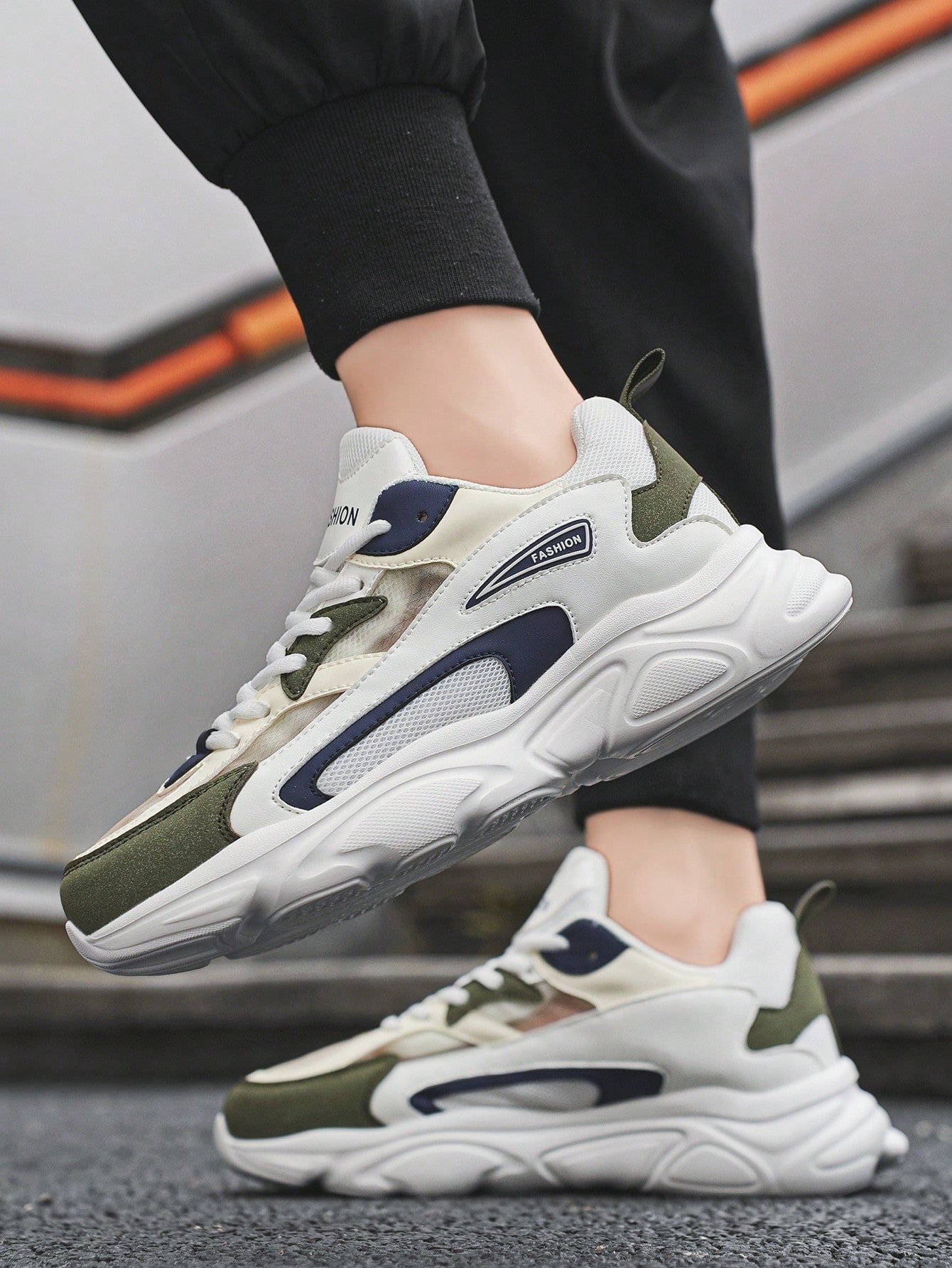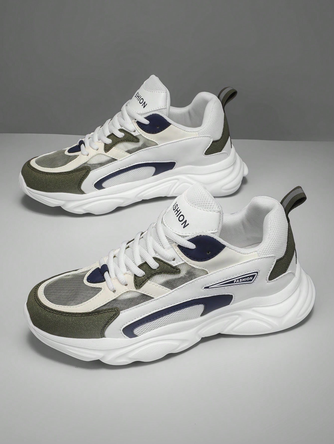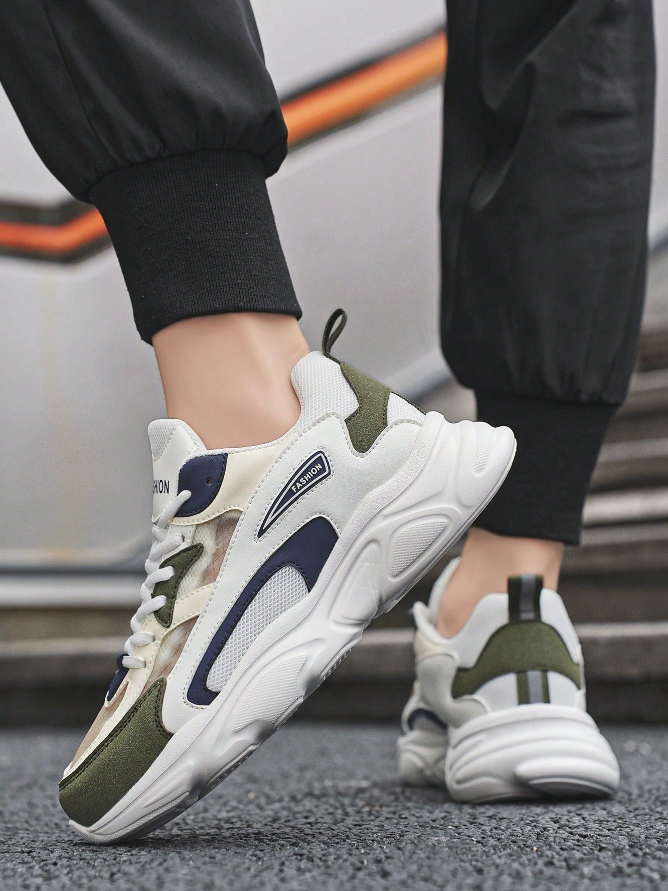 حذاء رياضي كاجوال للرجال متعدد الاستخدامات، مريح وذو شريحة سميكة ومبطنة للاستخدام في الأنشطة الخارجية، حروف شخصية وألوان متباينة مصنوع من جلد ولوح تخطيط للربط وتدريب، أبيض كاجوال