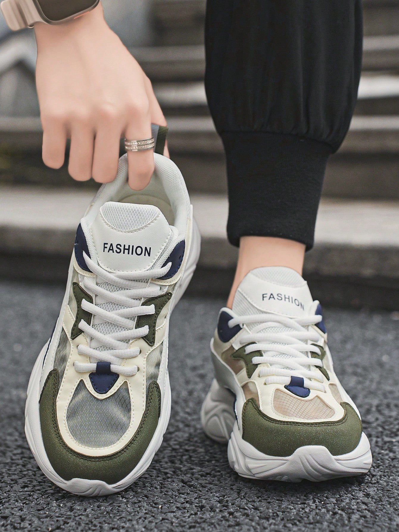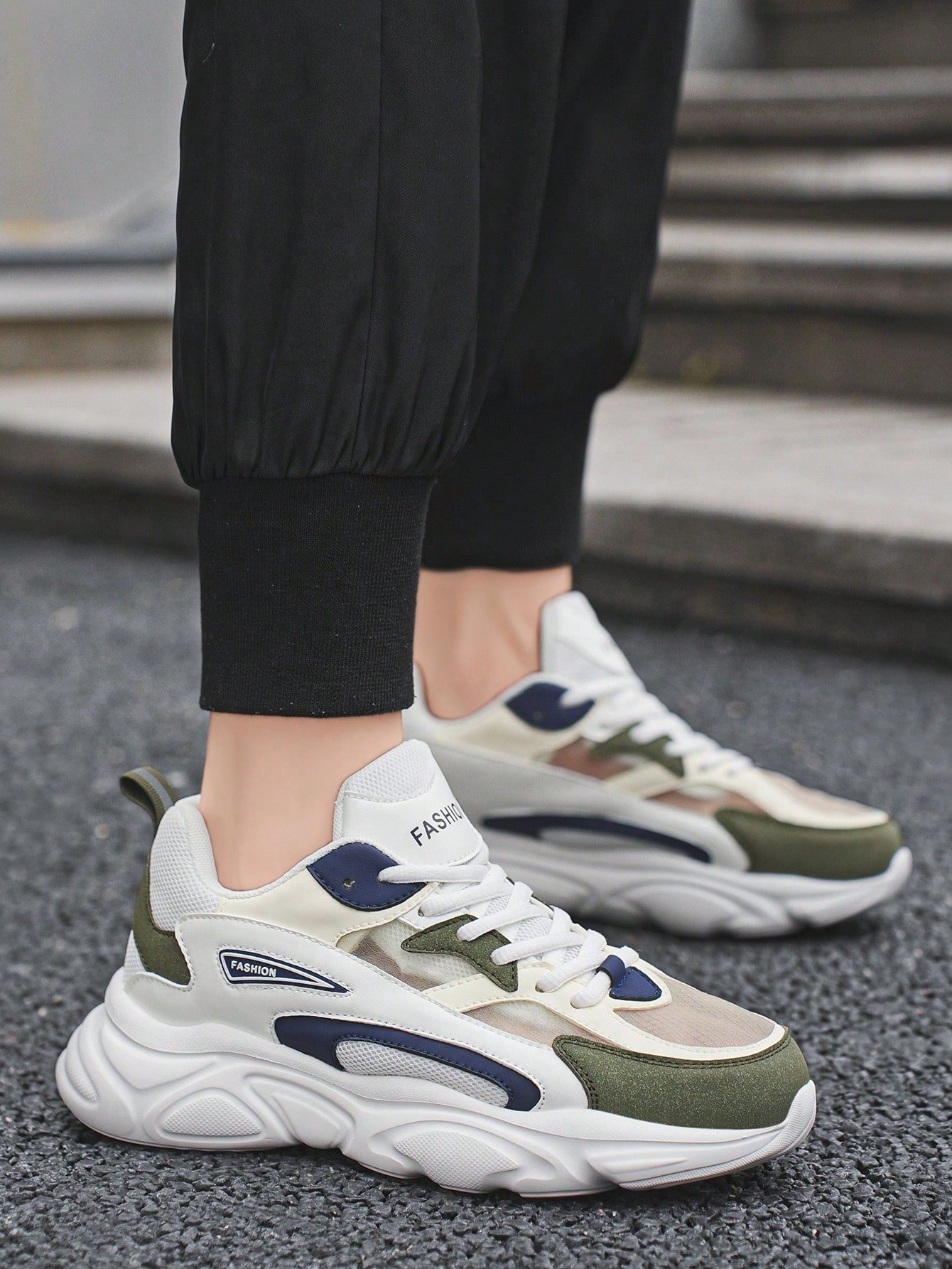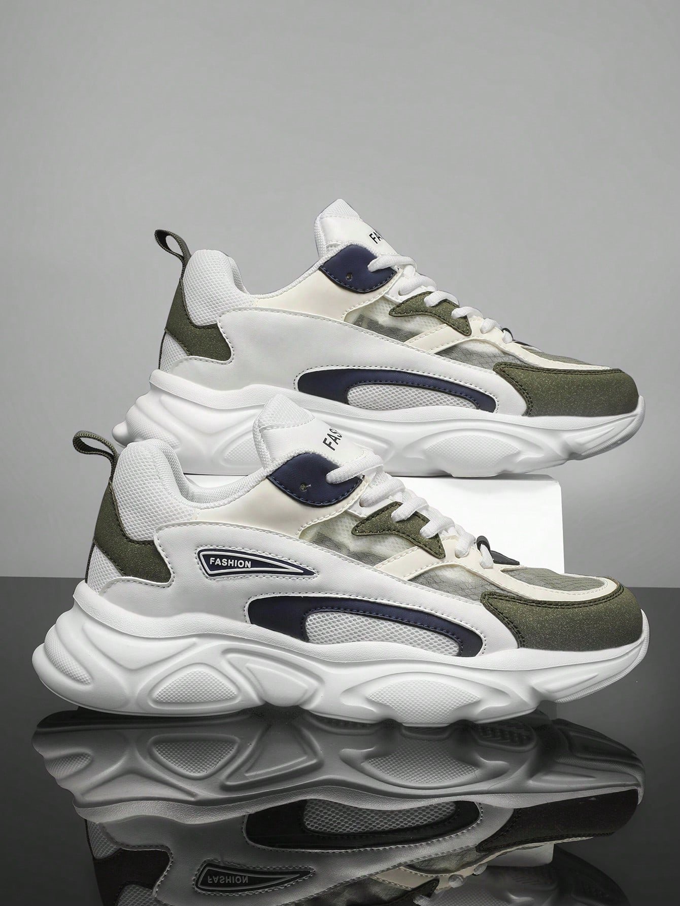 حذاء رياضي كاجوال للرجال متعدد الاستخدامات، مريح وذو شريحة سميكة ومبطنة للاستخدام في الأنشطة الخارجية، حروف شخصية وألوان متباينة مصنوع من جلد ولوح تخطيط للربط وتدريب، أبيض كاجوال